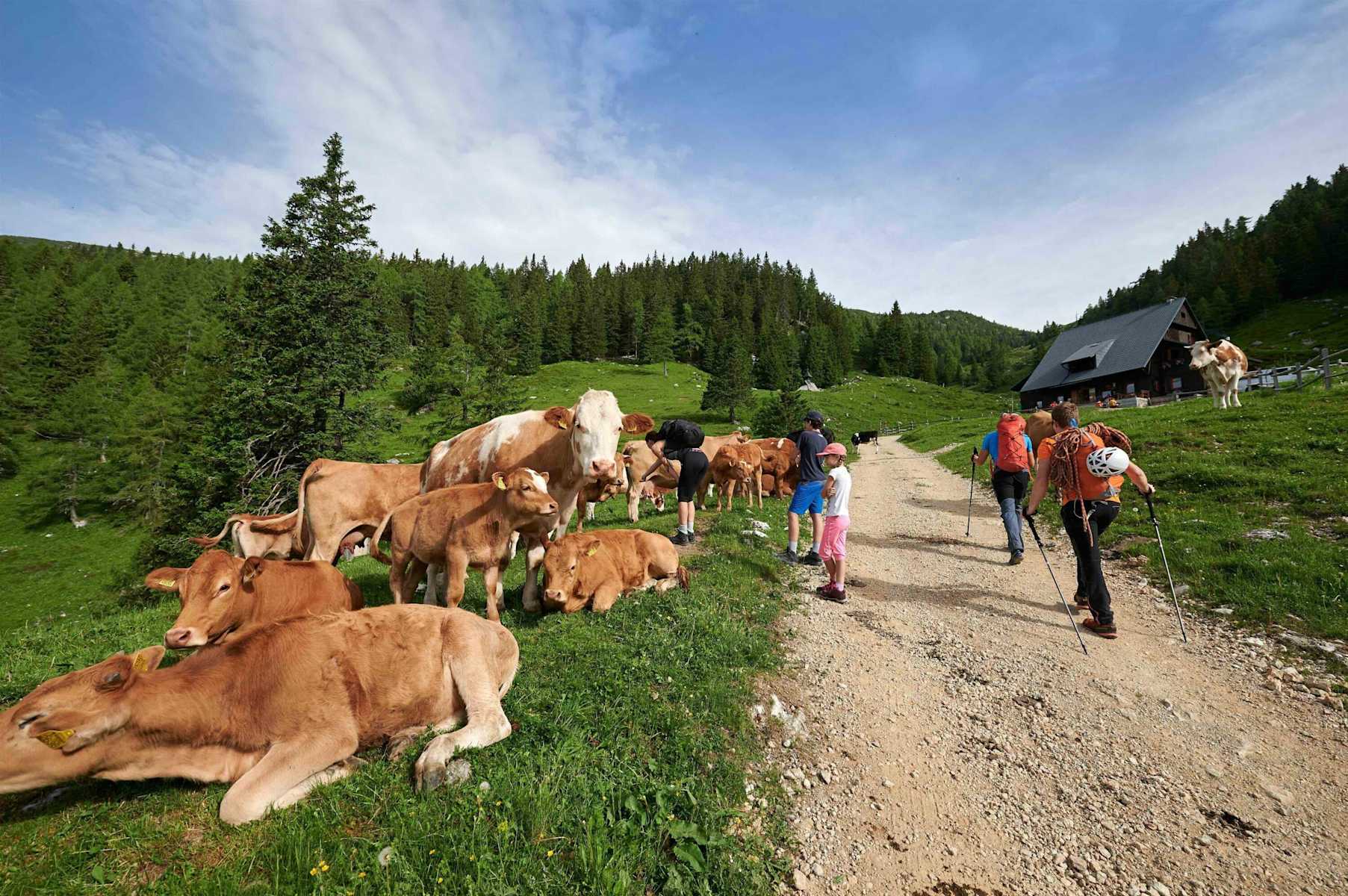 Vom Parkplatz bei der Eishöhle folgt man dem Wegweiser in Richtung Arta-Alm. Weiter auf gut markiertem Weg durch die „Kraje“ über Zelenica, wo man rechts abbiegt. Hier folgt man nun dem einfachen Weg zum Raduha-Gipfel, von dem aus man einen schönen Blick auf das obere Savinja-Tal und die Gipfel der Kamnik-Savinja-Alpen sowie der Karawanken genießt.
