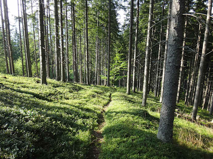 Etwas davor kreuzt die Straße einen Fahrweg mit Zaun. Direkt dort steht ein Baum mit Beschriftung „Thörl“ zur weiteren Orientierung. Man folgt der Grenzmarke und dem Zaun und überquert diesen auf des Grenzsteins Nr. 65 (Überstieg) auf ca. 1.480 m Seehöhe. Von hier führt ein nun deutlich erkennbarer Wanderweg zur Waldgrenze und dahinter liegenden Gipfelwiese.