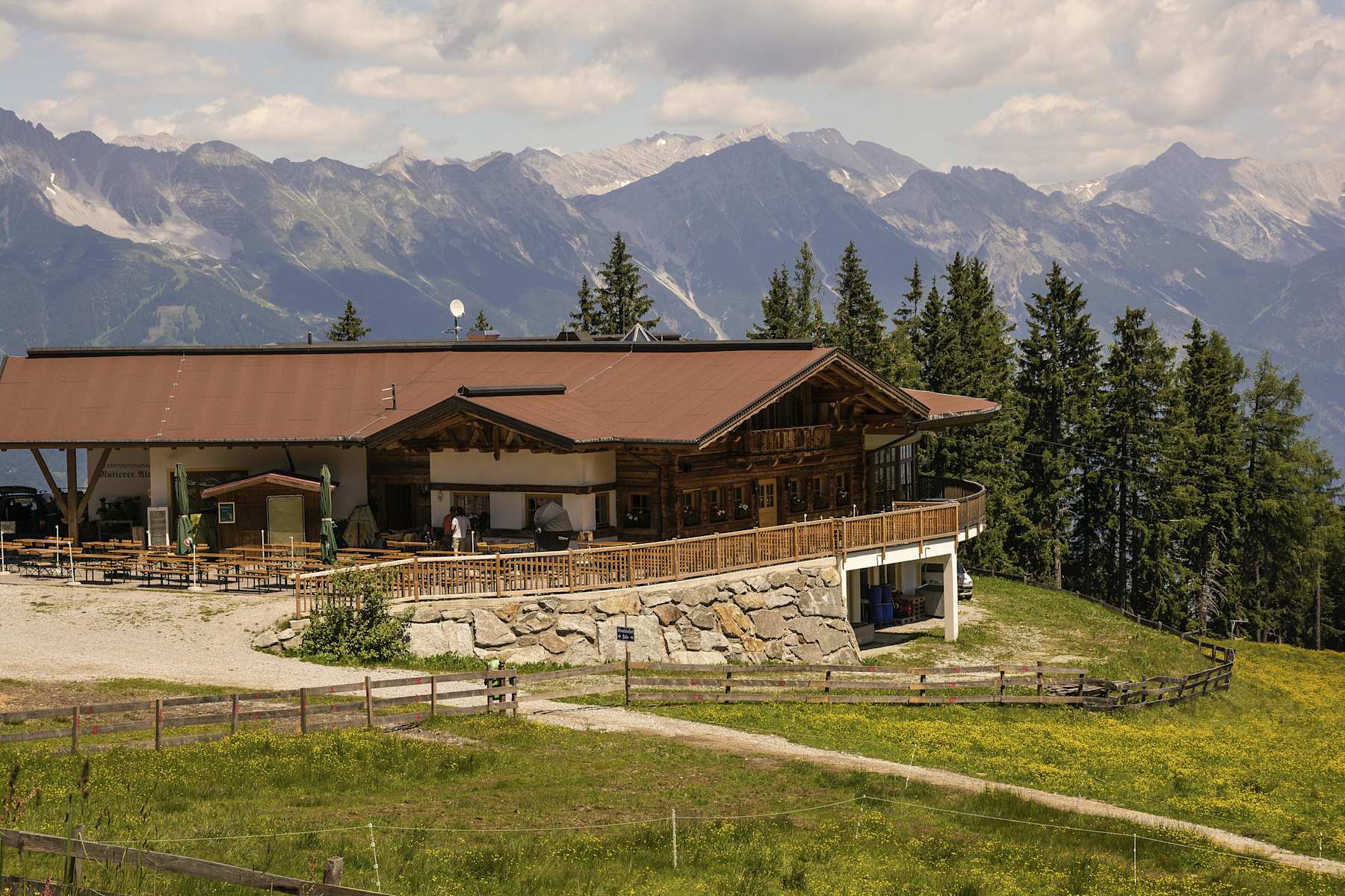 Danach folgt der Abstieg über die Muttererlam. Dabei genießt man schöne Ausblicke ins Inntal und auf die Nordkette. Unterhalb von Zwölferspitze und Pfriemeswand vorbei, erreicht man nach rund 1 h die Muttereralm, wo man noch einmal einkehren kann.