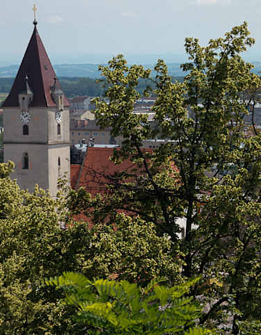 Nach einem kurzen Abstieg stehen wir am stimmungsvollen Hauptplatz der historischen Stadt Perg, früher weithin bekannt durch ihre Mühlsteinbrüche.