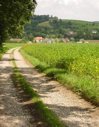 Vom Donausteig-Startplatz am Rand der Altstadt wandern wir auf Nebenstraßen in einem langen Rechtsbogen durch bäuerliche Kulturlandschaft: fruchtbare Felder, Gemüseanbau, große Bauernhöfe, Ab-Hof-Verkauf, Marterl, ... – Eferdinger Becken-Idyll pur!