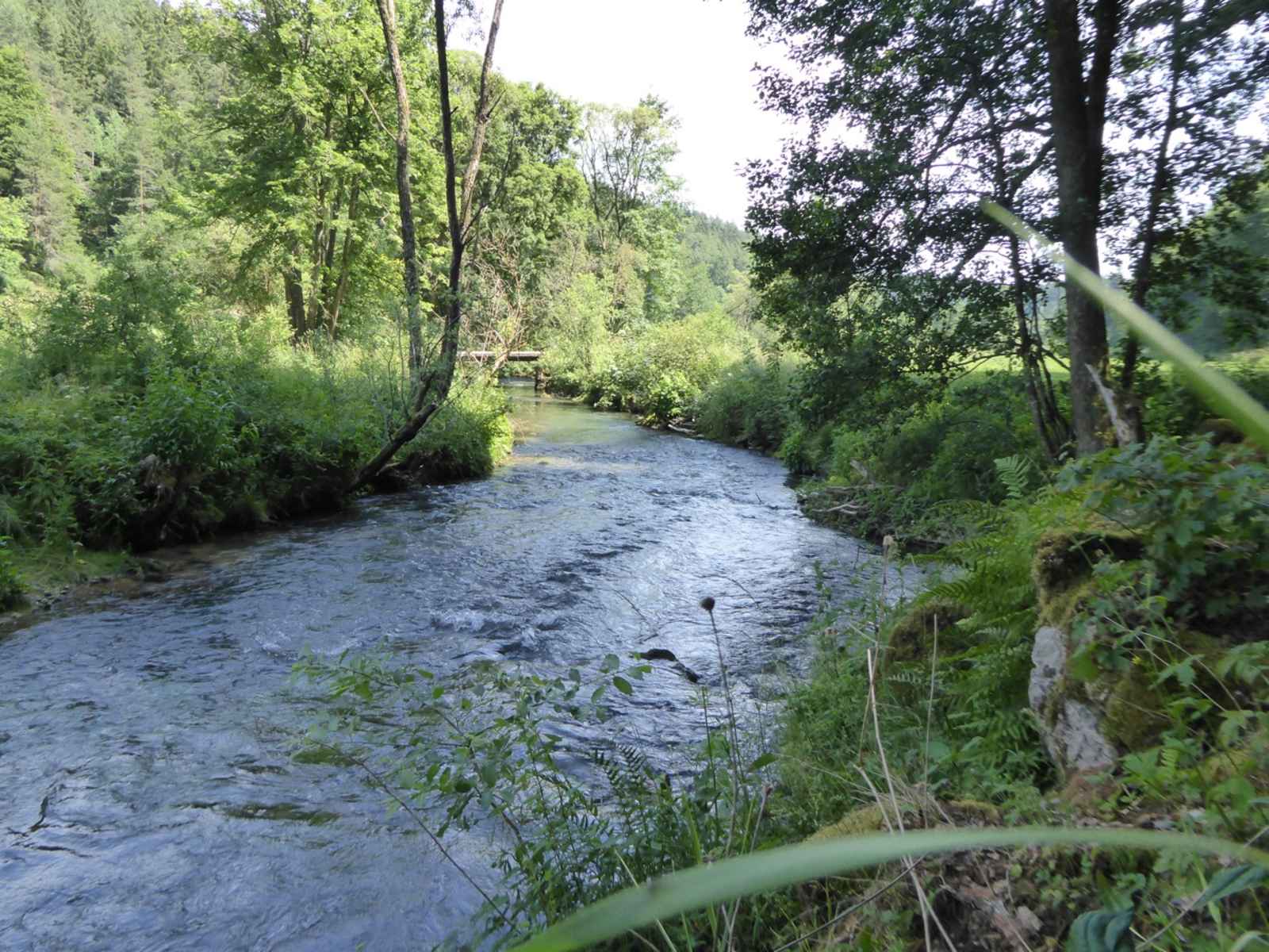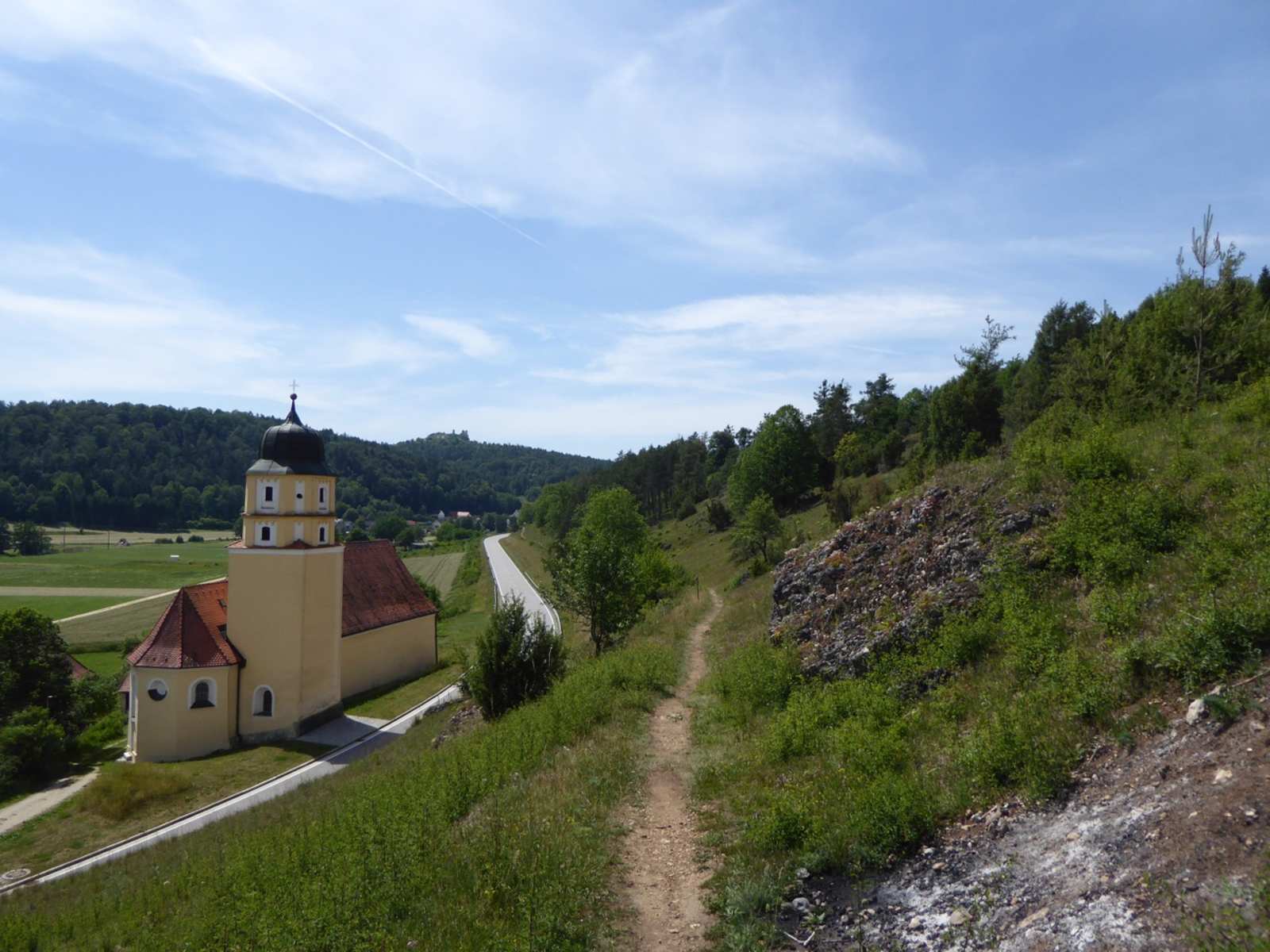 Im Westen von Schmidmühlen führt ein schmaler Pfad in den Blaugrund hinauf. Durch den Mischwald geht es recht wild aufwärts, bis man schließlich die Anhöhe erreicht und der Weg wieder flacher wird. Noch vor dem Ort Winbuch kann man immer wieder schöne Ausblicke auf die wellige Juralandschaft erhaschen.