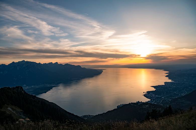 Abendlicher Ausblick vom Rochers de Naye auf den Genfersee Foto: Schweiz Tourismus
