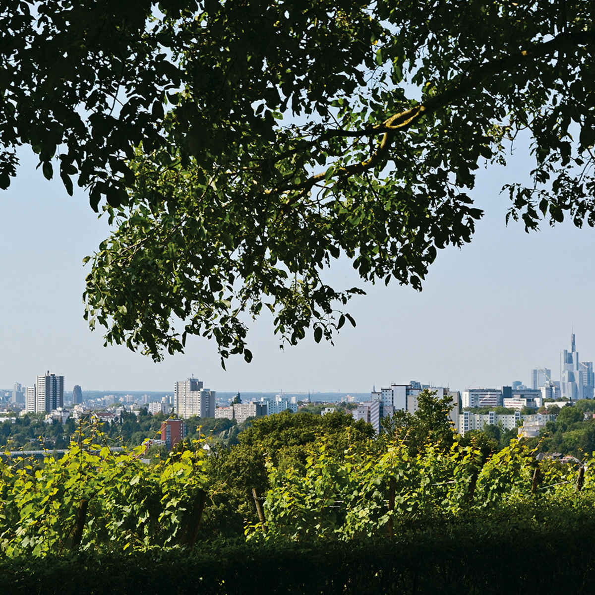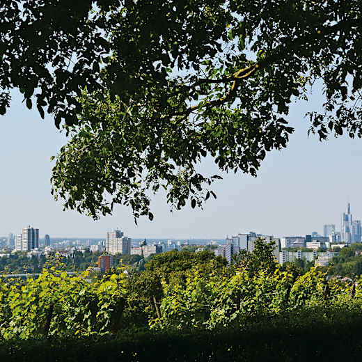 Doch erst gilt es, den Lohrberg zu überschreiten, den Hausberg der Frankfurter. Hier oben wird sogar Wein angebaut und über die Rebhänge bieten sich herrliche Ausblicke über die Dächer von Seckbach auf "Mainhattan" und Umland.