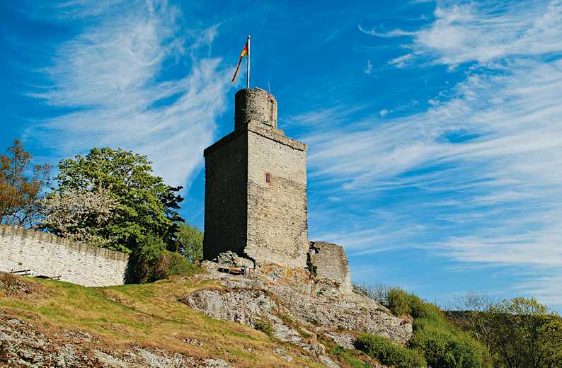 Vom Busbahnhofin der Stadtmitte von Königstein folgen wir der Markierung „schwarzes X“ zum Kurbad, hinter dem sich im Wald ein schmaler Pfad zu einem grandiosen Aussichtsplatz emporwindet. Die nächste Burgruine, die wir („schwarzem X“ durch den Wald folgend) nach einem knappen Kilometer erreichen, erweist sich zwar als deutlich überschaubarer als die Burg Königstein, ist jedoch nicht weniger eindrucksvoll – bietet sich von hier aus doch auch ein prächtiger Blick in die Ebene Richtung Frankfurt. Im Vordergrund ist die Burg Kronberg zu sehen. Auf dem schroff abfallenden Felssporn befinden sich neben der Burgruine Falkenstein auch Reste der Burg Nürings aus dem 11. Jh.