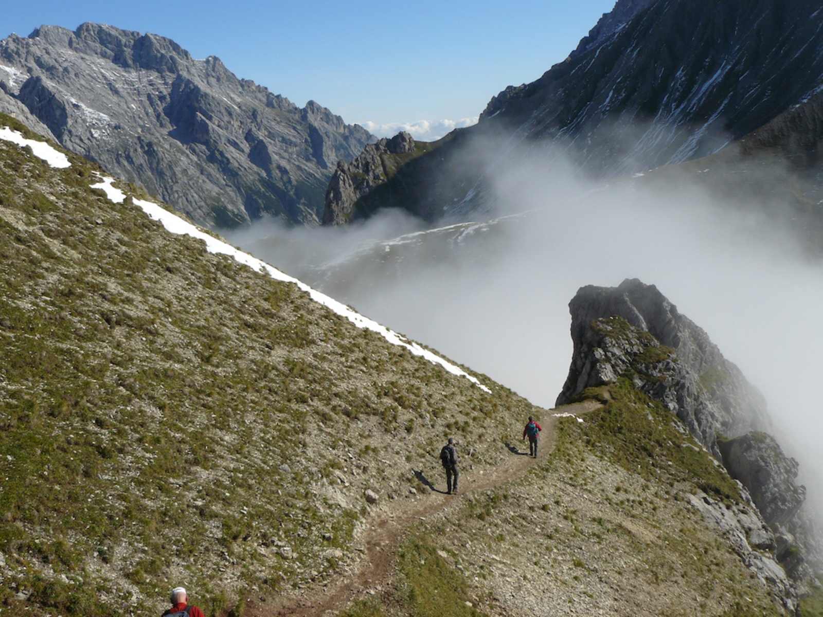 Man erreicht den Sattel Am Brand, der einen schönen Rastpunkt mit grandiosem Ausblick bietet. Nach einer Pause wandert man absteigend in einem Bogen zum nahen Feldernjöchl. Der Weg führt nun geradeaus weiter, immer noch leicht abfallend bis unter das Gatterl. Am Drahtseil geht es über die etwas ausgesetzten Felsen zum Einschnitt des Gatterls, einem ausgesetzten und seilversichertem Joch, hinauf. Dass man hier oben die Grenze zu Deutschland überquert, wird einem durch die aufgestellten Grenzschilder bewusst.