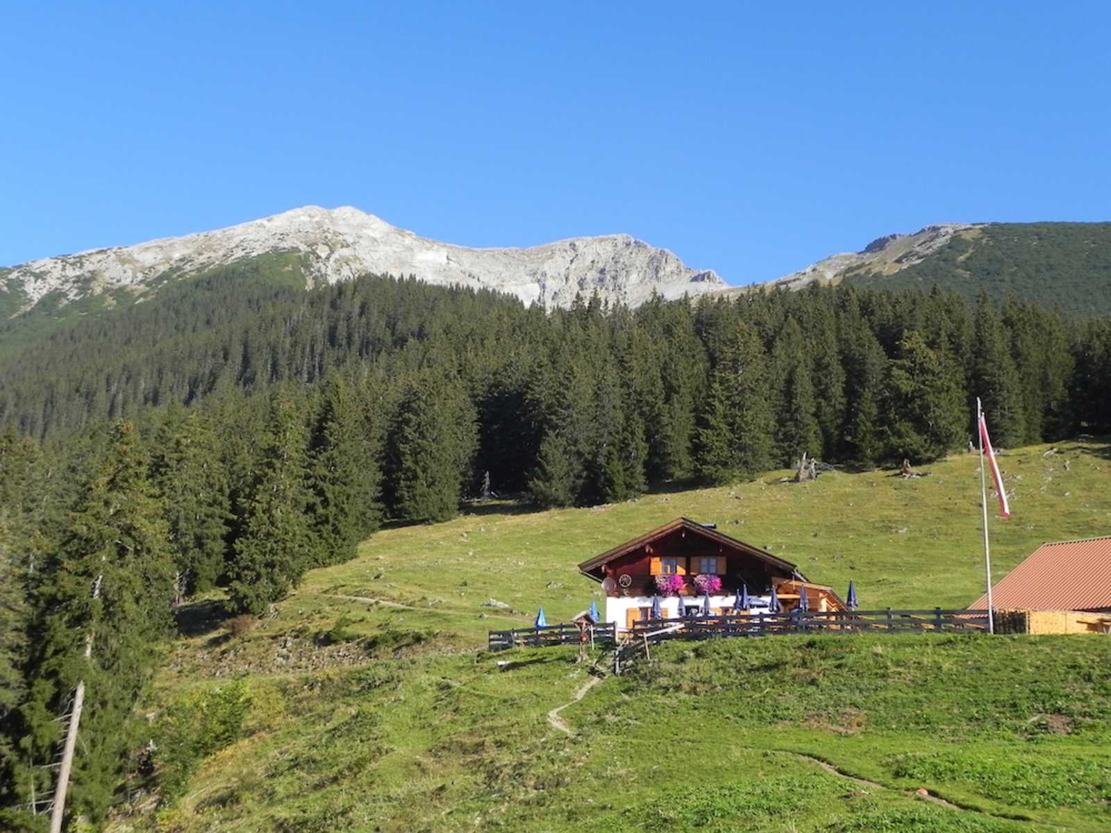 Nach einer kurzen Pause an der Alm folgt man dem Steig in Richtung Daniel. Er führt an einer kleinen Kapelle vorbei und taucht wieder in den Wald ein. Man wandert steil in einigen Kehren bergauf. Bald schon betritt man das Latschengelände, dass gerade im Sommer sehr heiß werden kann. Ein frühzeitiger Start macht sich hier bezahlt.