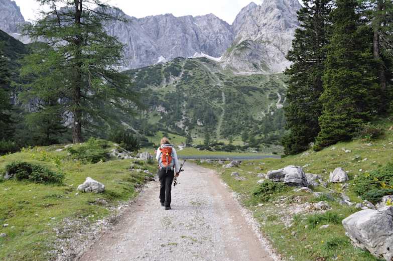 Auf dem nun wieder deutlich steileren Weg kommt man nahe an die Felswände der Tajaköpfe. Über Serpentinen steigt man hinunter in ein Waldstück. Durch dieses kommt man bald zur Almstraße, die man bereits vom morgendlichen Weg zum Seebensee kennt. Auf bekanntem Weg geht man zurück zur Ehrwalder Alm.