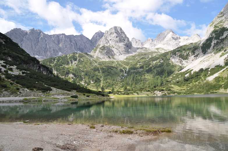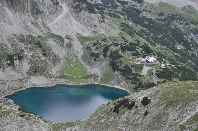 Hier geht man nach rechts und wandert auf dem breiten Weg gemütlich, teilweise sogar sehr flach zur Seebenalm und weiter zum Seebensee. Nun geht man am östlichen Ufer entlang zur Materialseilbahn der Coburger Hütte. Von hier führt der Steig über eine steilere Geländestufe in zahlreichen Kehren zur schön gelegenen Coburger Hütte bergan. Schön ist der dunkle, direkt unter der Hütte liegende Drachensee.