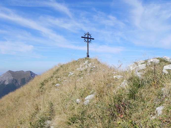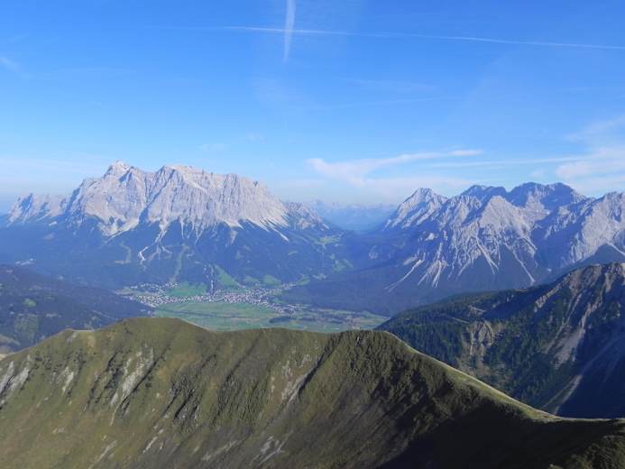 Der schmale Steig führt über den grasigen Grat bergauf. Nach einer kleinen Verflachung steilt er nochmals richtig auf bis zum kurzen Gipfelgrat. Dieser Schlussgrat führt flach nach Norden zum Gipfelkreuz auf der Bleispitze. Großartig ist die Aussicht vom Gipfelkreuz. Man lässt sich im Gras nieder und bewundert die Nordabstürze der Gartner Wand, das Zugspitzmassiv und den mächtigen Danielkamm.