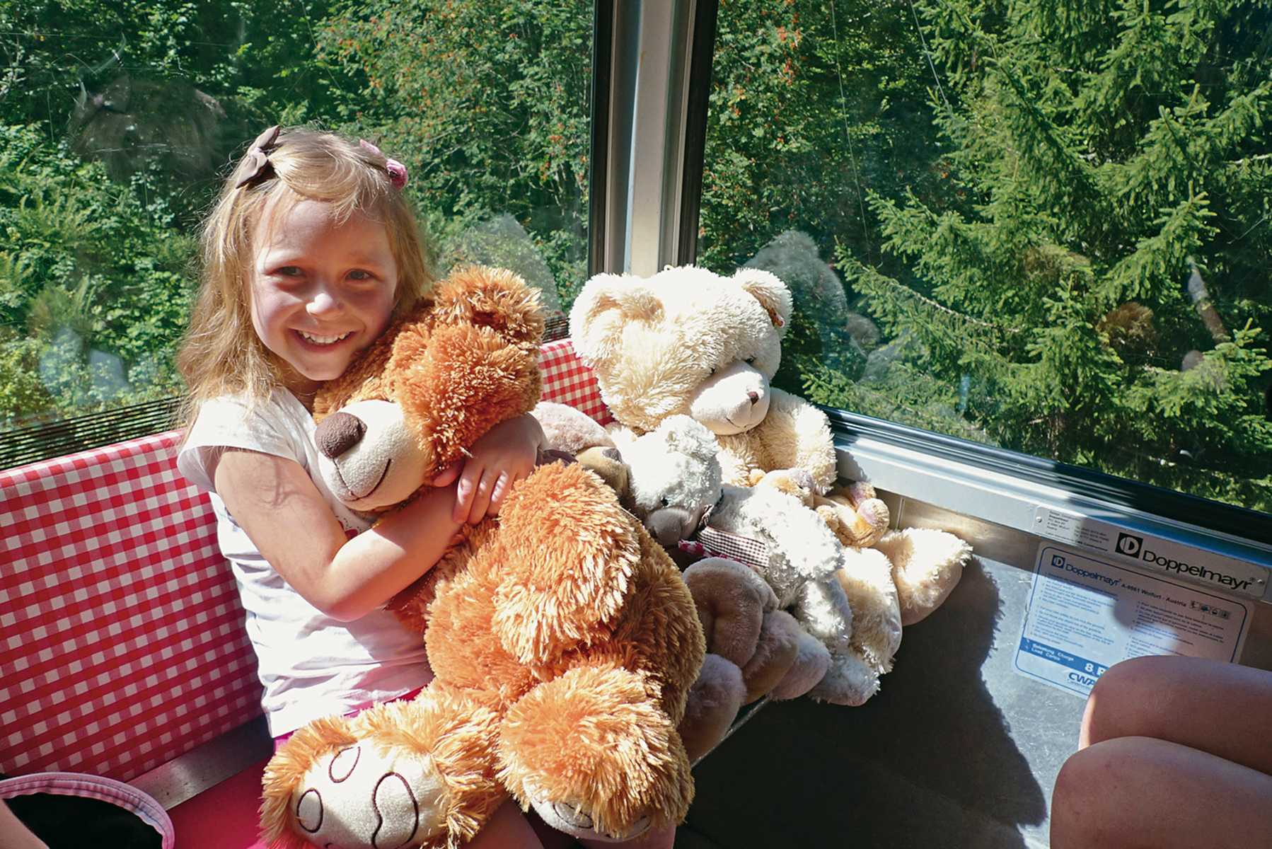 - Auffahrt mit der Sonnenkopfbahn. Etwa jede zweite Gondel ist eine "Bärengondel" mit vielen Teddybären zum in den Arm nehmen und liebhaben.