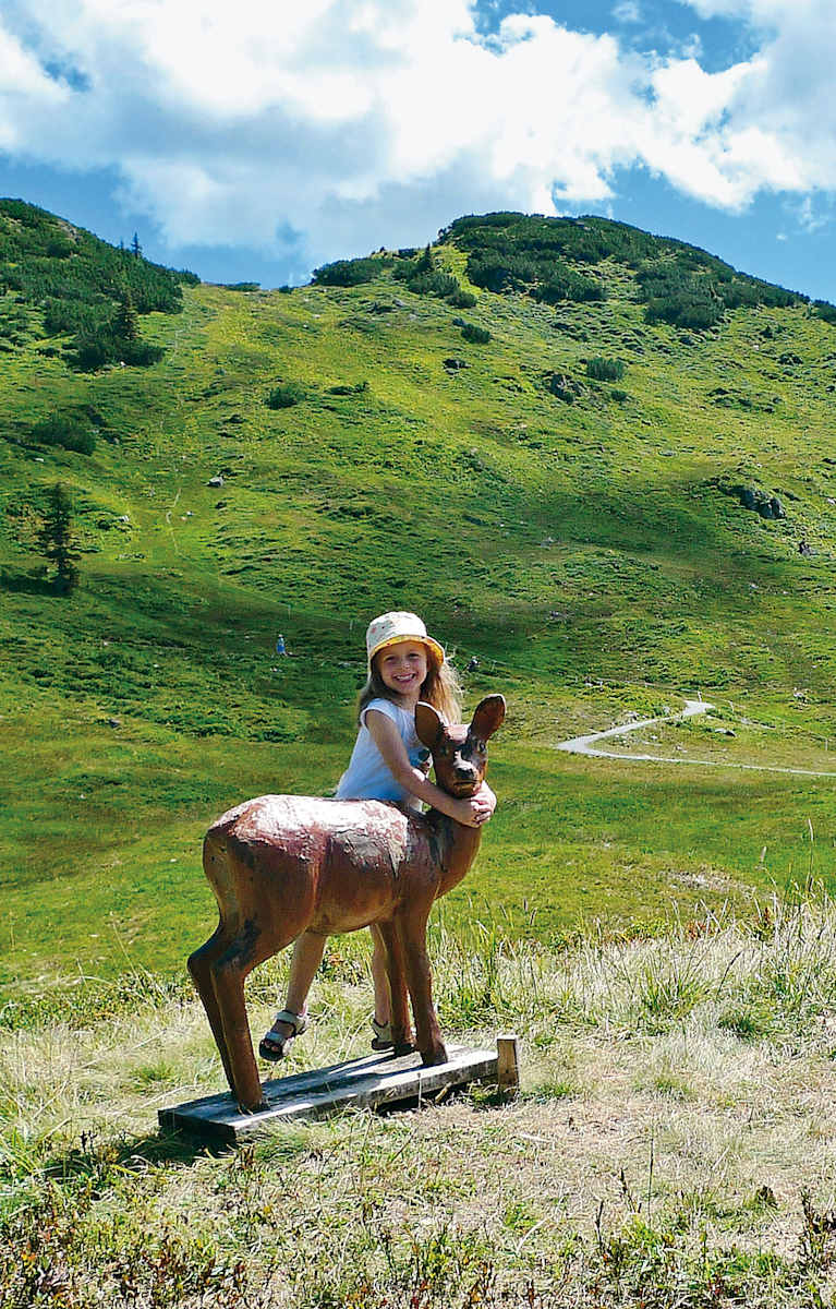 Rechts des Weges laden auf einem Hügel große Holzliegen zu einer Ruhepause ein, während die kleineren Kinder an zwei gut gemachten, auf der Wiese stehenden Kunststoff-Rehen ihre Freude haben. Den kurz darauf links abzweigenden, kleineren Weg über den Alpenblumenlehrpfad zur Bergstation merken wir uns für den Rückweg und marschieren geradeaus weiter abwärts. An der Talstation der Riedkopfbahn (nur Winterbetrieb) dreht der Weg nach links und wird nun schmaler und schöner.
