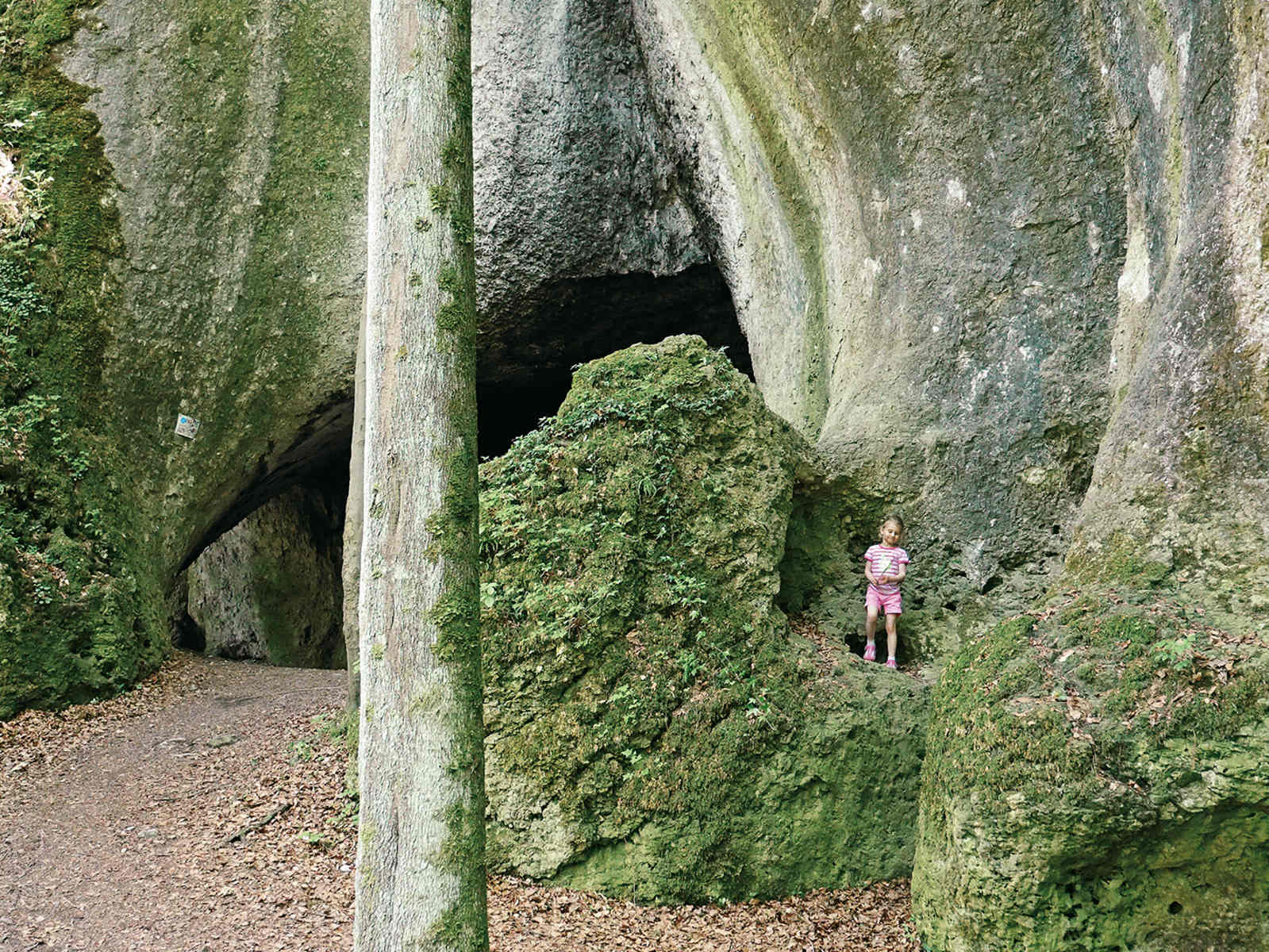 Für euch deutlich zu erkennen sind auf unserer heutigen Tour zum Beispiel die eingefallenen Bodentrichter der Dolinen. Noch spannender findet ihr aber bestimmt die skurrilen Felsgestalten der "Steinernen Stadt" und die Höhlen. Den großen Innenraum der Vogelherdgrotte könnt ihr euch auch ohne Taschenlampe anschauen, denn sie besitzt zwei riesige Eingänge. Wenn ihr den größten Tropfstein Deutschlands besichtigen möchtet, solltet ihr euch einen Besuch in der Schauhöhle Maximiliansgrotte nicht entgehen lassen.