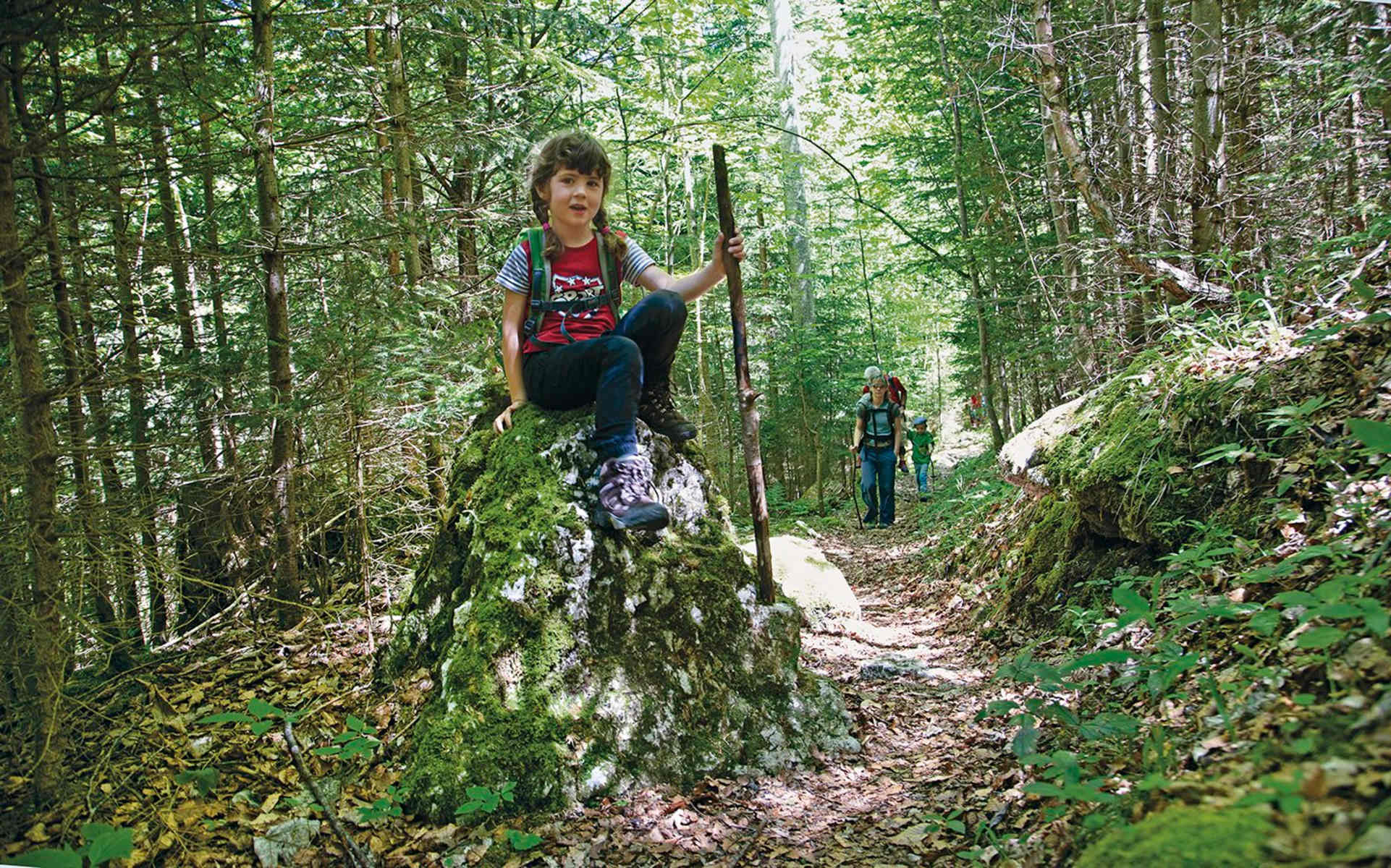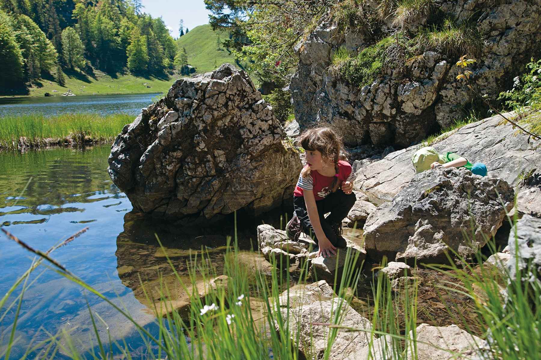 Ab 5  Jahren.Anfangs flache bis mäßig steile Forststraße; der Steig durch den Wald ist in Serpentinen angelegt, führt aber anhaltend bergauf und verlangt kleineren Kindern Durchhaltevermögen ab. Der Wiesenpfad zum See kann bei Nässe rutschig sein.