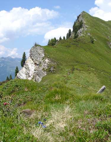 Von der Talstationfahren wir mit der Seilbahn zur Bergstation, 1.776 m, am Geiereck, dem nördlichsten Gipfel des riesigen Untersbergmassivs. Schon von hier aus hat man einen eindrucksvollen Blick auf das nun tief unten liegende Salzburg mit der markanten weißen Festung und den beiden Hügeln mitten in der Stadt. Von der Bergstation gehen wir – meist mit vielen anderen Wanderern – über den zunächst breiten Wanderweg, zuletzt über den schmalen Pfad auf den Gipfel des Salzburger Hochthrons, 1.852 m. Nachdem wir die tolle Aussicht ausgiebig genossen haben, laufen wir zurück zum Wanderweg und folgen nun im Sattel der Ausschilderung Richtung „Mittagscharte / Toni-Lenz-Hütte“ auf dem Weg 417. Dieser führt nahe der Wandabbrüche über den breiten Grat durch Latschen zum Hang oberhalb der Mittagscharte. In Serpentinen gelangen wir über diesen Hang hinab in die breite Scharte, 1.677 m.