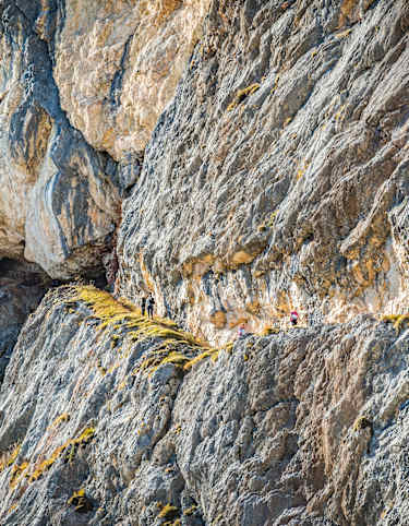 Aus der Mittagscharte steigen wir auf dem Thomas-Eder-Steig zunächst über zwei Leitern, dann über Holztreppen im Inneren des Berges, zuletzt über den breiten, aber dennoch ausgesetzten aus der Wand gesprengten Weg hinunter zum Wandfuß.