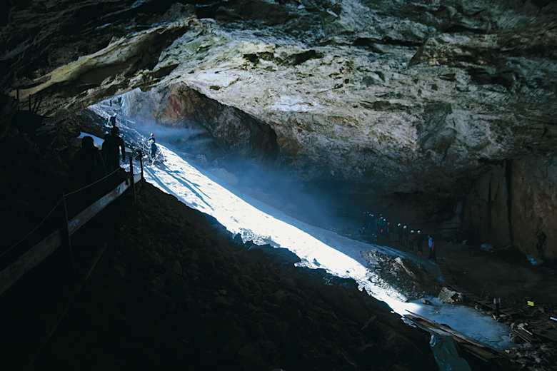 Tief im Inneren der Höhle erklärt der Höhlenführer die Bildung des Eises.Foto: Wolfgang Pusch, Bergverlag Rother