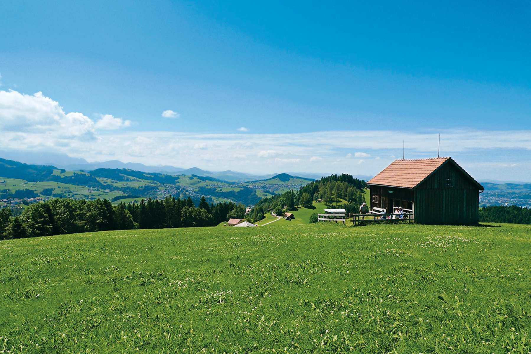 Vom Parkplatz des Skilifts Grub–Kaien überqueren wir die Straße, wenden uns rechts und wandern auf dem Gehweg neben der Straße Richtung Ortsmitte von Grub (AR). Nach etwa 200  m biegen wir an der Bushaltestelle „Krähtobel“ rechts in die mit dem Schild „Hartmannsrüti, Schwarzenegg“ versehene Bergstraße ein, der wir nun aufwärts folgen. Nach 20  Minuten wenden wir uns an einem Schilderbaum rechts („Kaien“) und wandern weiter auf Asphalt aufwärts. An einem abzweigenden Weg verweist uns ein Schild („Wanderweg“) weiter auf die Straße, fünf Minuten später biegen wir dann links in einen gekiesten Weg ein. Nach 100  m erreichen wir einen Schilderbaum, an dem wir nun rechts in einen (je nach Jahreszeit mehr oder weniger deutlichen) Wiesenpfad einbiegen („Kaienspitz“), der uns schön hinauf zum Waldrand und zu einer Rastbank führt. Rechts der Bank geht es auf einem Pfad in den Wald und bald geradewegs den Berghang hinauf. An einer Rastbank überqueren wir einen Kiesweg und steigen weiter durch Wald bergan. Wir stoßen auf einen breiten Kiesweg, wenden uns links und biegen nach 150  m – anders als uns hier die Beschilderung „Wanderweg“ leiten möchte – rechts in einen kleinen Pfad ein, der uns nun abwärts direkt durch den schattigen Spielplatz mit Wippe, Schaukeln und großer Rutsche zum Naturfreundehaus Kaien führt. In dem gemütlichen Gastgarten besteht Selbstbedienung, die Speisen werden nach der Bestellung gebracht. Im Gebäude selbst gibt es auch einen Kicker.
