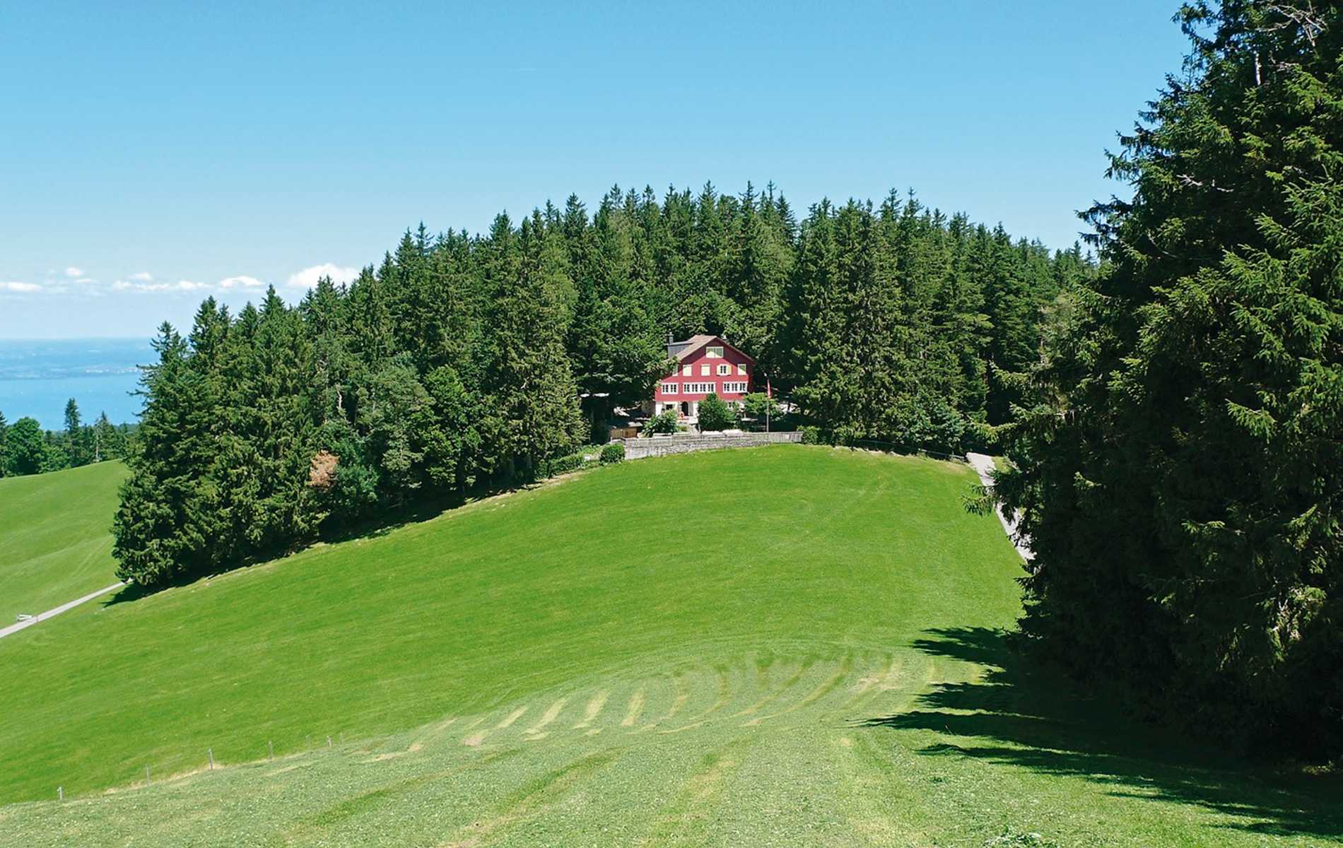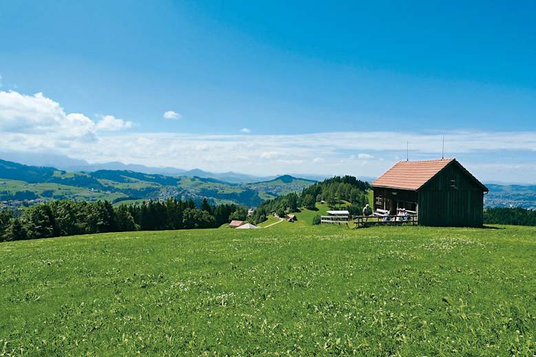 Am Ende des kleinen Waldstücks geht es durch einen Zaundurchlass wiederum auf eine Weide. Hier muss man nun schon genau hinschauen, um den mitten über die Wiese abwärtsführenden Pfad zu erkennen. Schließlich treffen wir auf einen hölzernen Zaun, finden ein paar Meter rechts am Waldrand einen Zaundurchlass und wandern weiter in der Gehrichtung von vorhin über die Wiesen. Kurz darauf treffen wir auf einen Schilderbaum, ziehen hier unsere Schuhe wieder an, falls wir barfuß unterwegs waren, und wenden uns nach rechts in Richtung „Grub (AR)“. Es geht nun auf einem breiteren Weg gemütlich abwärts. Nach einer Weile wird der Weg zum Karrenweg mit Wiesenmittelstreifen und wir haben nochmals einen schönen Blick auf den Bodensee. Schließlich stoßen wir auf ein Asphaltsträßchen, biegen links ein und wandern hinunter nach Halten. Wer im Gasthaus Bären einkehren möchte, überquert die Landstraße, die anderen wenden sich vorher bereits rechts („Grub AR“) und wandern auf einem wieder etwas von der Landstraße wegführenden Asphaltsträßchen weiter. Schließlich kommen wir wieder zur Landstraße, überqueren sie, wenden uns nach rechts und sind schon fast wieder amParkplatz angelangt.