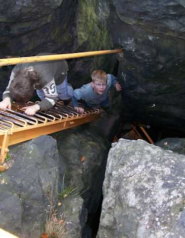 Nach einem langen Abstieg über eine Gitterrosttreppe kommen wir an einem steinernen Tisch vorbei und entdecken gleich dahinter eine kleine Höhle. Doch Vorsicht! Die Höhle ist hinten offen, es besteht Absturzgefahr! Hier befand sich vor über 100 Jahren eine kleine Sommerwirtschaft mit Getränkeausschank. Heute sieht man noch einige Balkenfalze und eine Felstreppe, die auf einen Absatz über der Höhle führt.