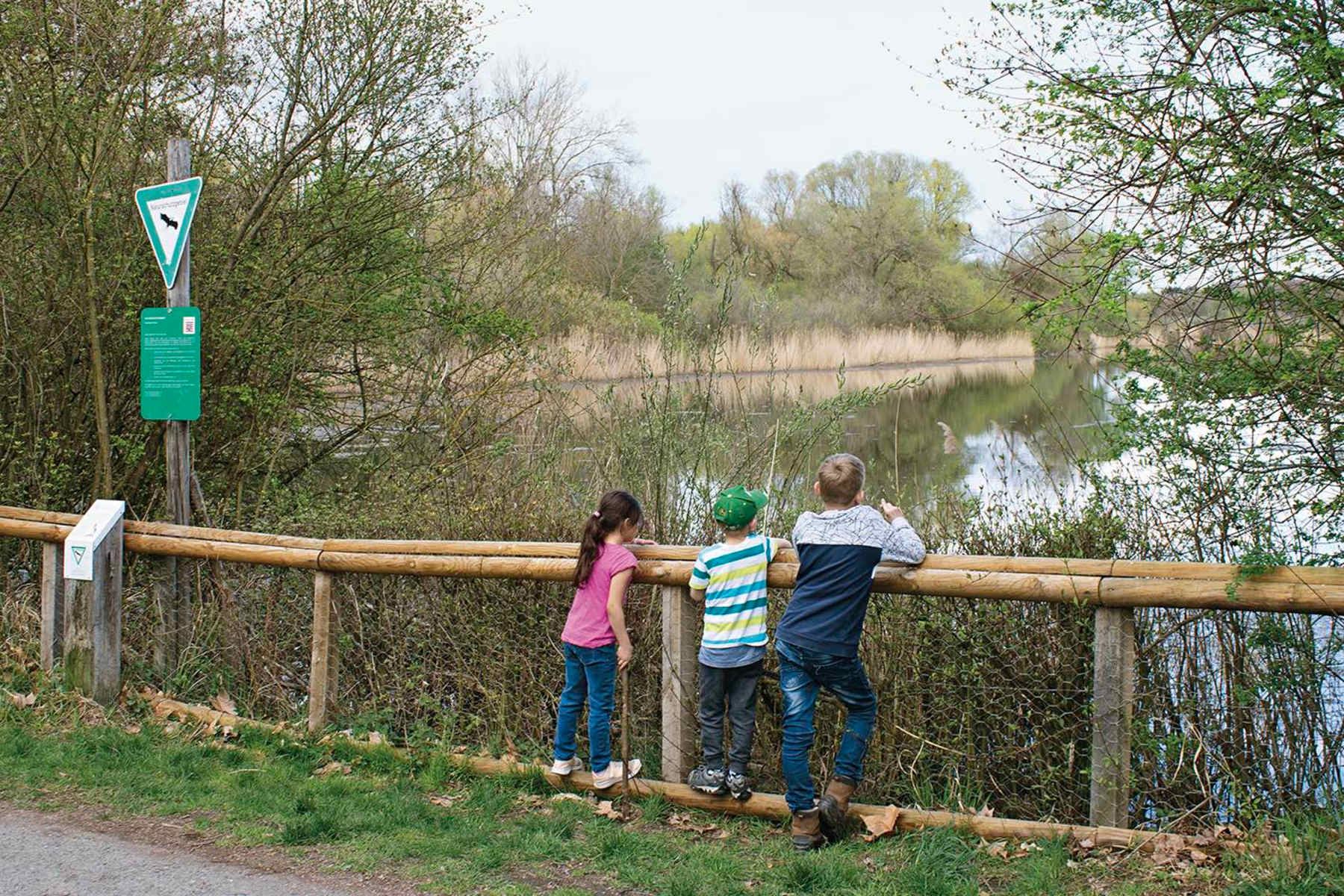 Wenn wir uns ausgetobt haben, geht es auf unserem bisherigen Weg weiter geradeaus, bis wir nach 600 m eine Schutzhütte erreichen. Ein Abstecher zum Fechenheimer Weiherlohnt sich und ist mit nur weiteren 200 m geradeaus ein Katzensprung. Wir können den Blick aufs Wasser nur kurz genießen oder aber den See umrunden (zusätzlich 900 m), bevor wir zur Schutzhütte zurückkehren und dem GrünGürtel-Rundwanderweg nach rechts über die Autobahnbrücke folgen. Nach 200 m verlassen wir den GrünGürtel-Wanderweg vorerst und steuern geradeaus direkt den Riedteich im Naturschutzgebiet Enkheimer Ried an. Dort steigen wir auf die Aussichtsplattform, um einen weiten Blick über das Naturschutzgebiet zu genießen. Seltene Wasservögel tummeln sich hier und vielleicht sonnt sich auch irgendwo eine Schildkröte.