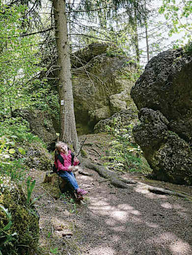 Ab 5 Jahren. Die Wanderung verläuft überwiegend auf wurzeldurchsetzten Wanderpfaden im ständigen Auf und Ab. In den steileren Passagen sind stellenweise Treppenstufen vorhanden. Nicht trittsichere Kinder sollten an den ausgesetzten Wegstellen an die Hand genommen werden. Bei Nässe oder nach Regenfällen ist von der Tour abzuraten! Durchgehend markierte, größtenteils schattige Wanderung.