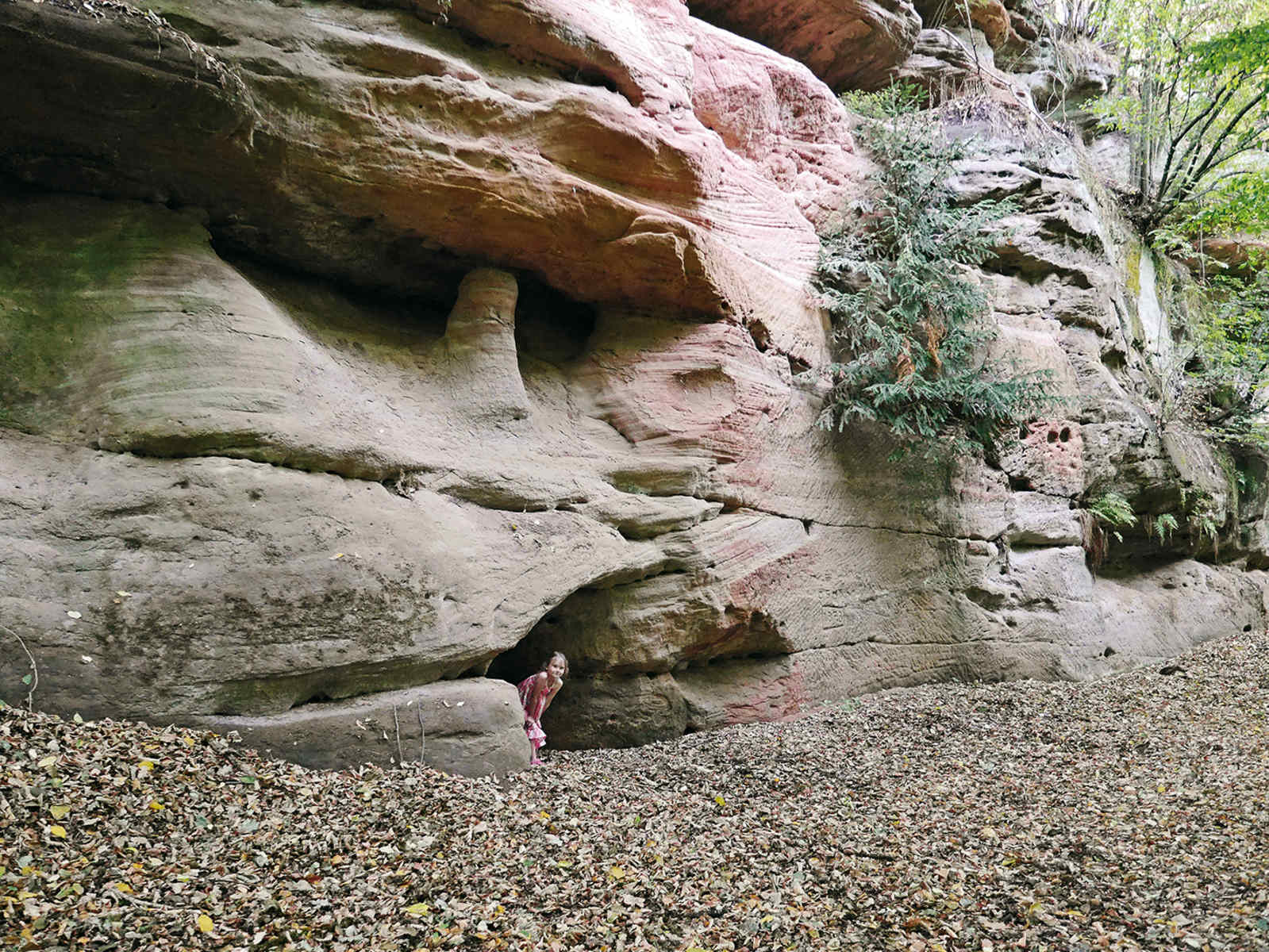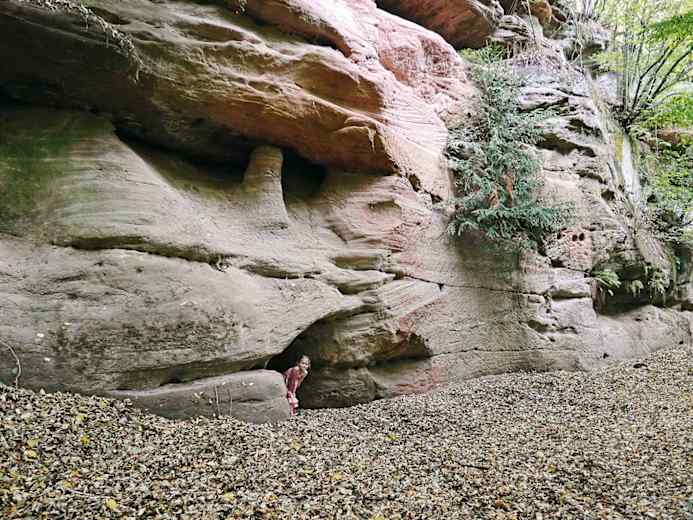 Wisst ihr, wie die Schwarzachklamm entstanden ist? Vor Millionen Jahren lag das Flussbett der Schwarzach viel weiter oben als heute, etwa in Höhe des Biergartens. Doch im Laufe der Zeit hat sich der Fluss durch die Kraft des Wassers immer tiefer ins Gestein eingeschnitten. Weil der hier vorkommende Burgsandstein sehr hart und widerstandsfähig ist, konnte das Wasser nur an Spalten ins Gestein eindringen und nach und nach weichere Gesteinsschichten auswaschen. Vor allem durch die Wucht des Wassers bei Hochwasser entstanden unzählige Brandungshöhlen und Nischen, die ihr heute in den Felswänden der Schlucht sehen könnt. Kaum zu glauben, welche Kraft Wasser entwickeln kann!