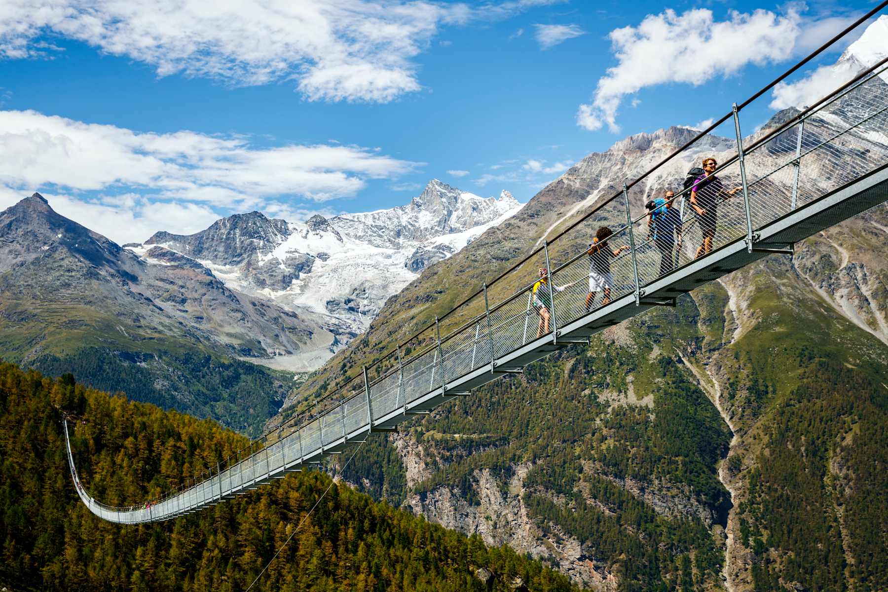 Von der Europahütte geht es über die Weltrekord-Hängebrücke, die längste Fussgänger-Hängebrücke der Welt, die das Grabengufer überspannt. Sie ist 494 m lang und am höchsten Punkt schwebt man 85 m über dem Abgrund. Dann geht es weiter Richtung Täschalp und schliesslich nach Zermatt.