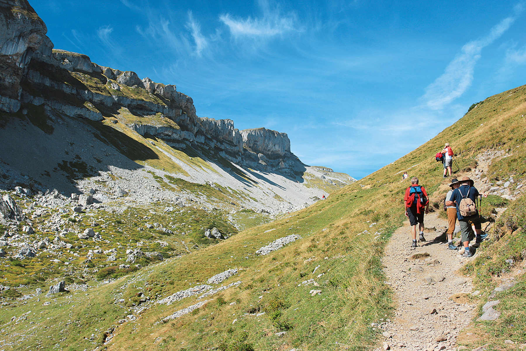 Durch ein ausgedehntes Geröllfeld steigen wir steil bergan bis direkt zum Fuß einer senkrechten Felswand; ein wenig leichte Kletterei, die aber mithilfe von Seilsicherungen problemlos zu bewältigen ist, bringt uns hinauf zum Grat. Der Kontrast zwischen der schattigen Nordwand und der sonnendurchfluteten Hochfläche, die uns erwartet, könnte kaum größer sein: Wir stehen oben auf der schräg nach Süden fallenden, etwa 300 x 1500 m großen Felsplatte, die sich überraschend grün präsentiert und ein herrliches freies Panorama offenbart.