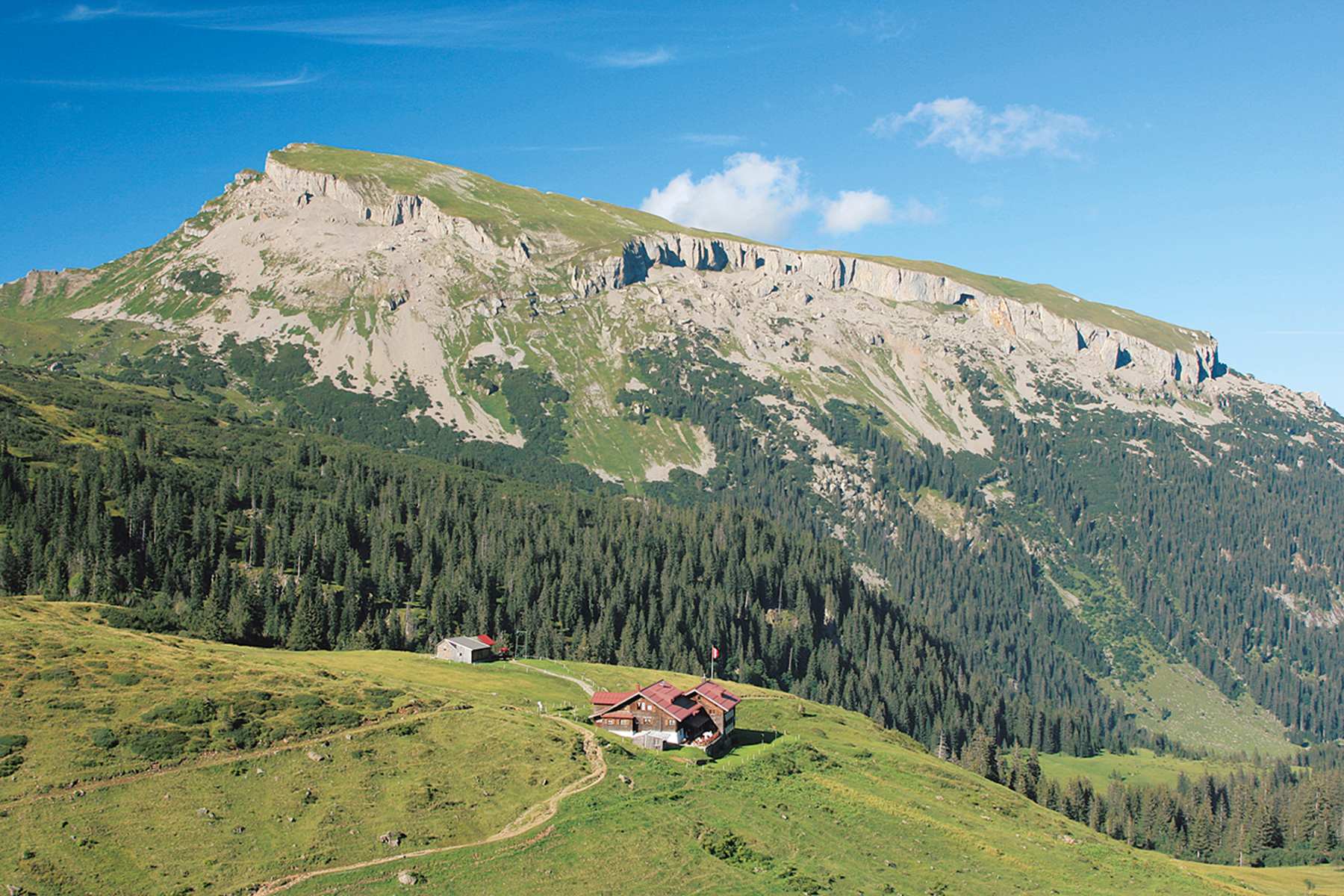 In weitem Bogen geht es über offene Wiesen durch das hintere Schwarzwassertal, vorbei an der Ifersguntalpe (1.751 m) bis zur schön gelegenen Schwarzwasserhütte (1.620 ) m. Fast das gesamte Tal wird von den hohen, grasbewachsenen Flyschgipfeln der Ochsenhofer Köpfe, des Grünhorns und Steinmandls geprägt, während sich als Kontrastprogramm dazu in unserem Rücken der gewaltige Hohe Ifen in den Himmel reckt.