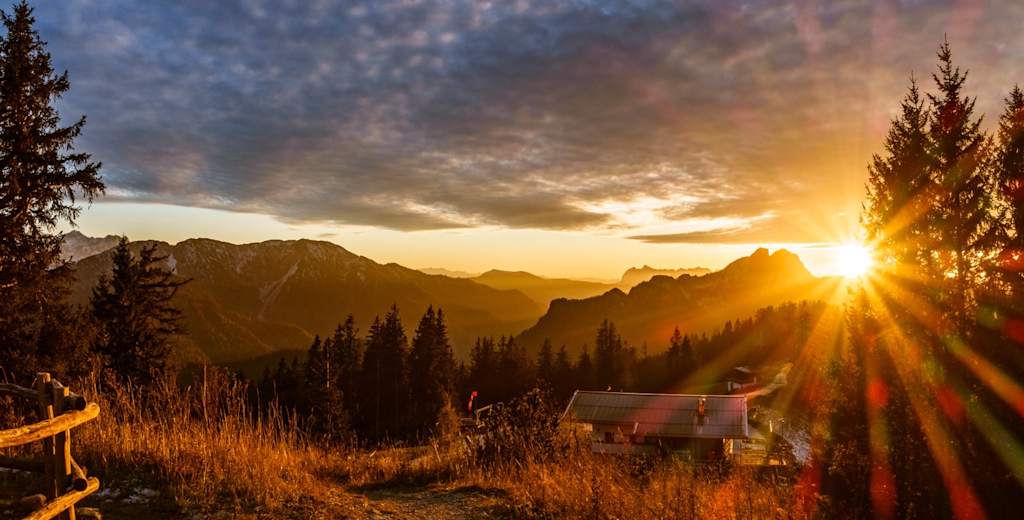 Das Panorama von der Alm ist gewaltig. Man sieht vom Chiemsee über die Berchtesgadener Alpen, die Loferer und Leoganger Steinberge bis zum Wilden Kaiser.