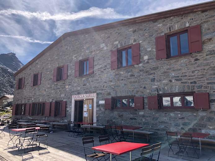 Das Berggasthaus Fuorcla Surlej lädt zur ersten Rast ein. Foto: Riki Daurer, alpinonline
