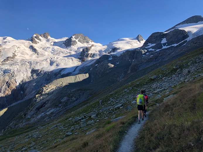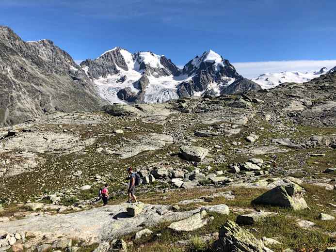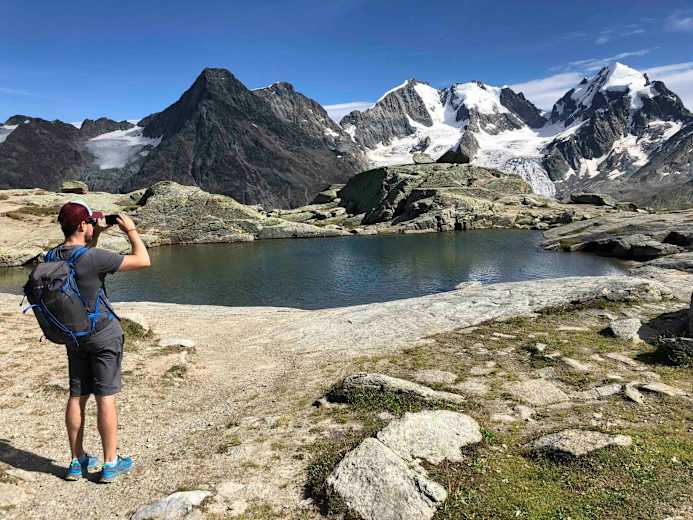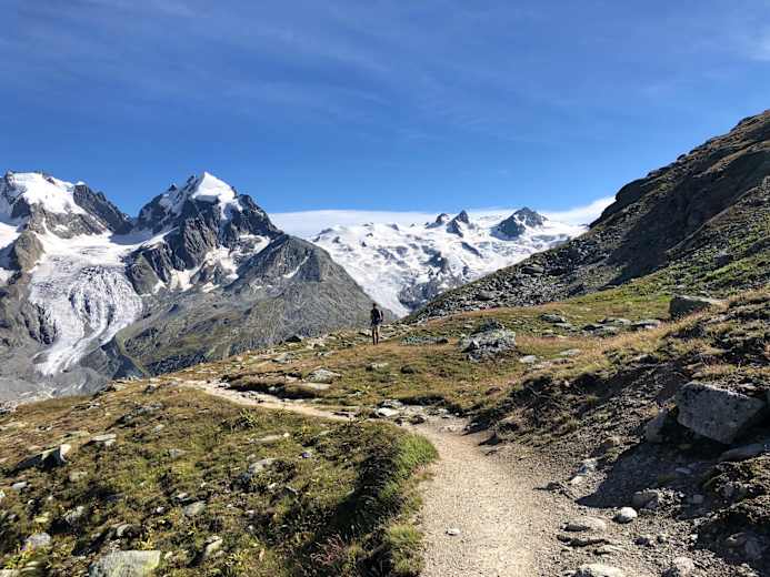 Diese Wanderung muss man einfach nur genießen; das Bergpanorama ist absolut beeindruckend. Man sieht sowohl hinunter auf den Gletschersee Lej da Vadret, hinüber zur Tschierva Hütte als auch auf die Berge Piz Glüschain (3.594) und Chapütschin (3.386 m) und links auf den Piz Bernina mit seinen beachtlichen 4.049 m und mit dem bekannten Biancograt.