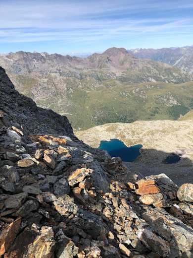 Ab hier geht es nun nach Süden über Blockende und einen Blockgrat hinauf zum Piz dal Lej Alv. Auf diesen letzten Höhenmetern steigert sich die Schwierigkeit auf T3-T4 und es ist auch eine kurze Kletterstelle zu überwinden.