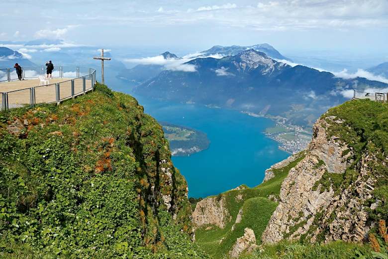 Nach der Bergfahrt orientieren wir uns auf dem Stoos an den gelben Wegweisern zur westlichen Seite hin und beginnen den Aufstieg auf einem breiten Karrenweg mit einer ausgeprägten Linksschleife. Über die Matten der Fronalp weiter nach Mettlen, 1.599 m, und danach rechts ausholend durch den Nordhang des Charenstöckli, wo die Trasse vorübergehend steinig wird. Plötzlich öffnet sich ein erster voller Seeblick. Nachdem das Charenstöckli umgangen ist, schließt ein weiterer Grashang am Oberfeld zum Gipfelplateau des Fronalpstocks, 1.920 m, auf. Neben dem Gasthaus dockt auch der Sessellift an – ein paar Schritte weiter kommt man zu den beiden Aussichtsplattformen direkt über dem Urnersee. Die Tiefblicke sind wirklich atemberaubend!