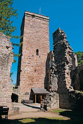 In Sommenhardt folgen wir am Wegweiser der gelben Raute Richtung Zavelstein, Wanderheim Zavelstein. Am Gasthof Sonnenhof Löwen halten wir uns links, neben einem kleinen Fahrsträßchen nehmen wir den Fußweg nach Zavelstein. An der Sporthalle und Feuerwehr gehen wir durch die Schulstraße, links abwärts am Friedhof vorbei zur Ortsmitte. Bald ist die Burgruine Zavelstein erreicht – die Turmbesteigung ist ein Muss. Für Kinder ist die mittelalterliche Burgruine mit ihren alten Gemäuern, Treppen und dem angrenzenden Spielplatz ein wahres Paradies. Hier können wir noch durch die Gassen schlendern und/oder einkehren.