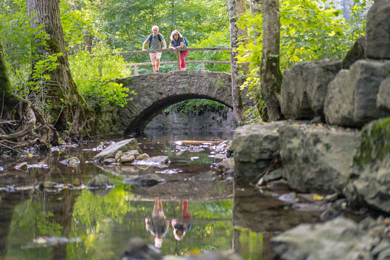 Nun folgt man dem Weg entlang des idyllischen Baches. An einer Wegteilung geht man nach links durch den Wald aufwärts in Richtung Schwalldorf. Der Abstieg zurück ins Katzenbachtal erfolgt durch die wild-romatische Wolfsschlucht. Man passiert die Römerquelle und wandert weiter zum Parkplatz am Kurpark.