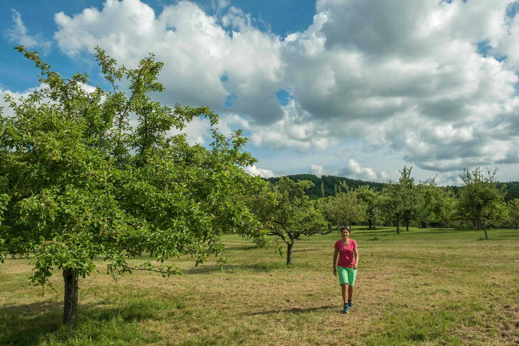 Bald geht es rechts ab und auf Naturwegen durch Obstwiesen und steinigen Richtung Mössingen. Der Linsenbühl, eine Kuppe mit Bank, ist ein guter Platz um die Landschaft zu genießen. Kurz vor dem Ortseingang passiert man die Straße zur Ziegelhütte erneut und wandert durch ein Hohlweg und dann wieder durch weitläufige Streuobstwiesen.