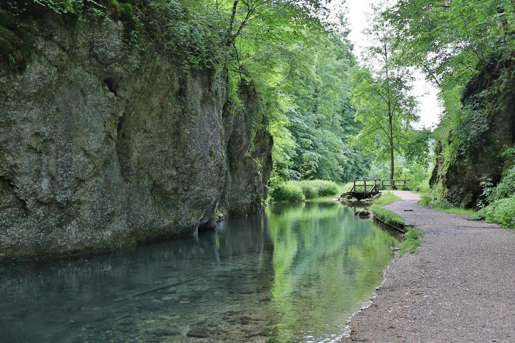 Ein schöner Pfad bringt uns hinunter zur Hayinger Brücke mit Grillstelle. Hier beginnt das romantische Glastal. Bei der Wanderung durch das Tal passiert man die Bären- und Glashöhle und blickt hinauf zum Kreus auf dem Lämmerfelsen. An der Hasenbachquelle verlässt man das Glastal und folgt dem Weg etwas oberhalb zum Schloss Ehrenfels. Durch eine alte Kastanienallee erreicht man wieder den Parkplatz an der Wimsener Höhle.