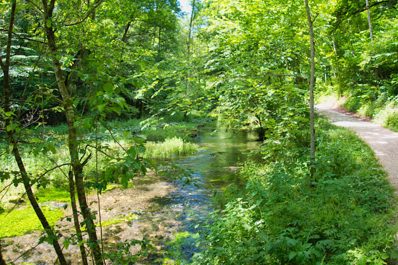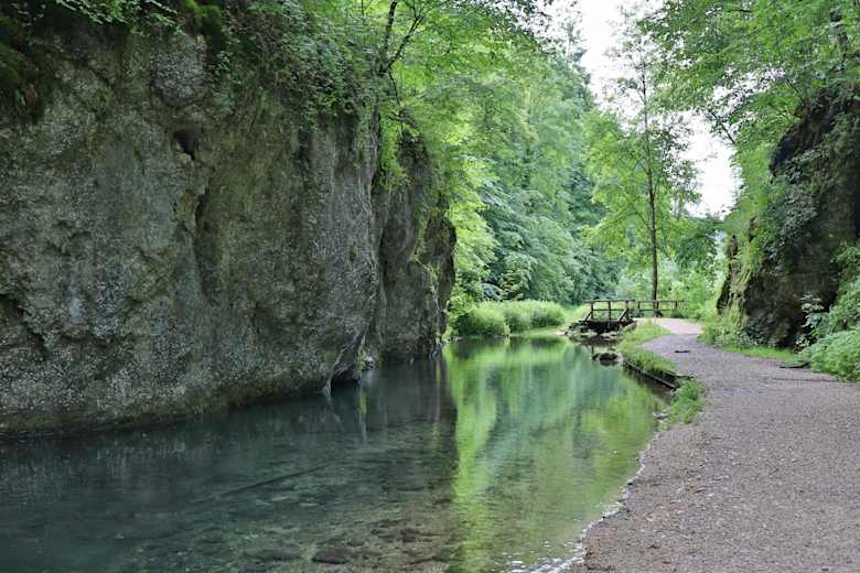 Vom Parkplatz an der Wimsener Höhle wandert man auf einem Pfad durch das Tal bis zu Schloss Ehrenfels. Man überquert die alte Steinbrücke und folgt dem Hasenbach. Es geht weiter über zwei schöne Holzbrücken zu einer am Wasser gelegenen Bank.