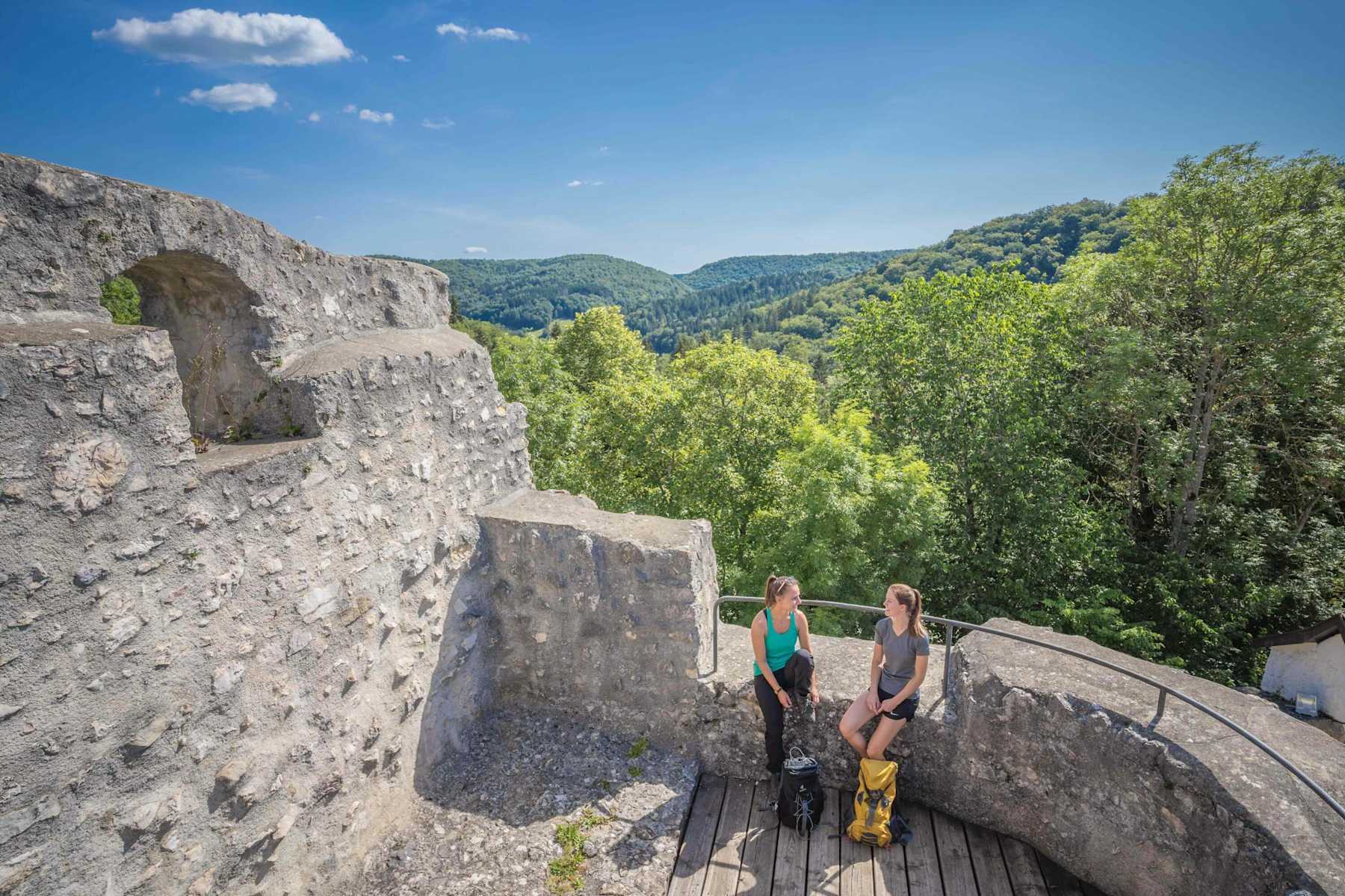 An der Münzdorfer Brücke biegt man scharf nach rechts ab und folgt dem steilen Pfad hinauf zur Berg Derneck. Hier im Albvereinshaus kann man einkehren und übernachten.