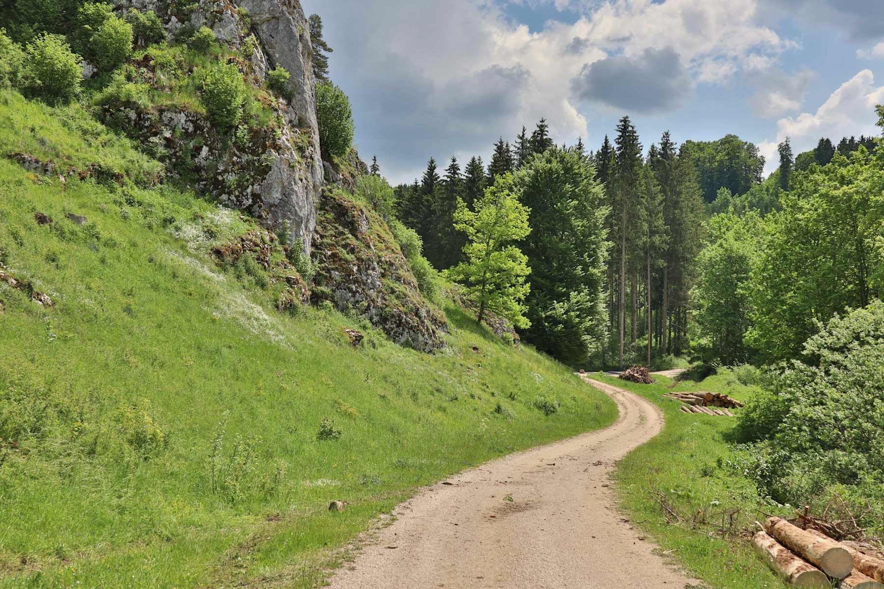 Dann nimmt man einen schmalen Pfad aufwärts und genießt einen tollen Blick über das Lehrtal bis hin zum Tieftal. Man passiert ein paar Felsen und verlässt den Wald. Nun geht es am Waldrand entlang zum Sportplatz. Der Weg biegt scharf nach links ab und führt ins Lehrtal. Ein Pfad bringt uns aus dem Tal hinauf zum Waldrand. Nach dem Wald geht es über Wiesen mit schönen Blicken auf Pfronstetten zur Straße.