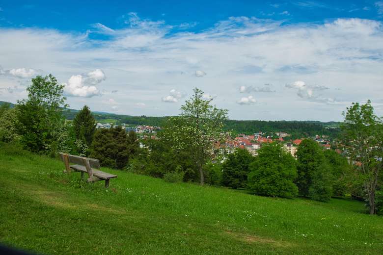 Vom Wanderparkplatz am Hofgut Hopfenburg geht man an der Schranke vorbei und dannnach links in Richtung Süden zum Aussichtpunkt Beutenlay. Hier bietet sich ein schöner Blick ins Heutal und nach Apfelstetten. Der Ort lädt mit seinen Bänken zum Verweilen ein.