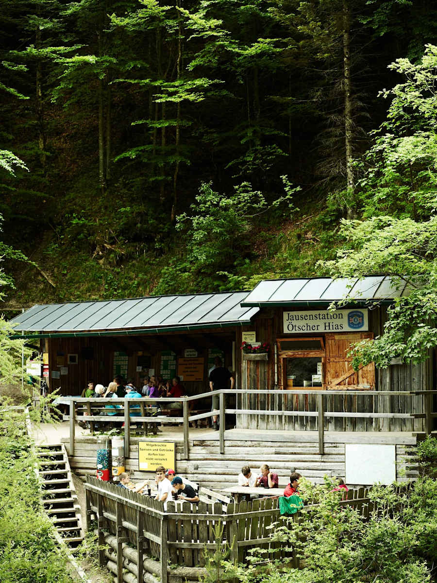 Man quert den hier breiten Ötscherbach und hält sich links - direkt hinein in die imposanten Ötschergräben. Entlang der Steiganlage geht es nun - immer mit Blick auf das rauschende Wasser des Ötscherbaches - bis zur Jausenstation Ötscherhias.
