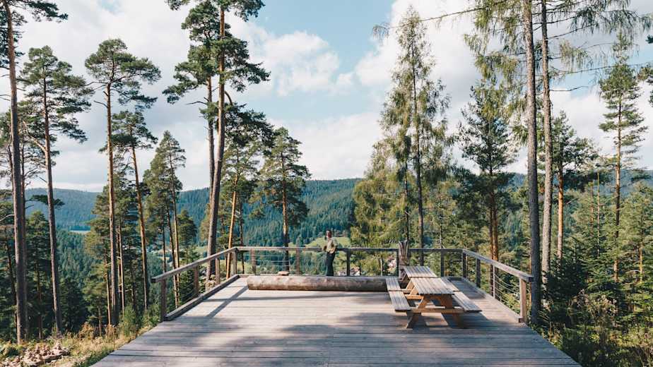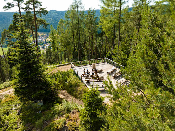Nun geht man hinunter zur Heidelbeerplattform, von der man eine schöne Aussicht bekommt. Der Weg führt hinunter zur Enz und weiter zum Hirschkopf und der Erdbeerplatte. Man genießt einen wunderbaren Ausblick nach Enzklösterle oder macht es sich auf der Waldschaukel gemütlich.