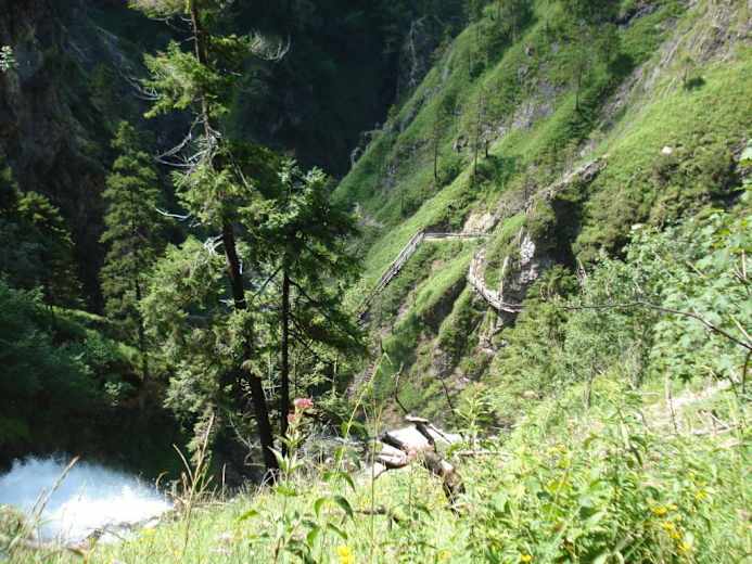 Von der Hängebrücke am nördlichen Ufer der Salza führt der Steig ca. 300 m Fluß abwärts bis zur Abzweigung zur Wasserlochklamm.