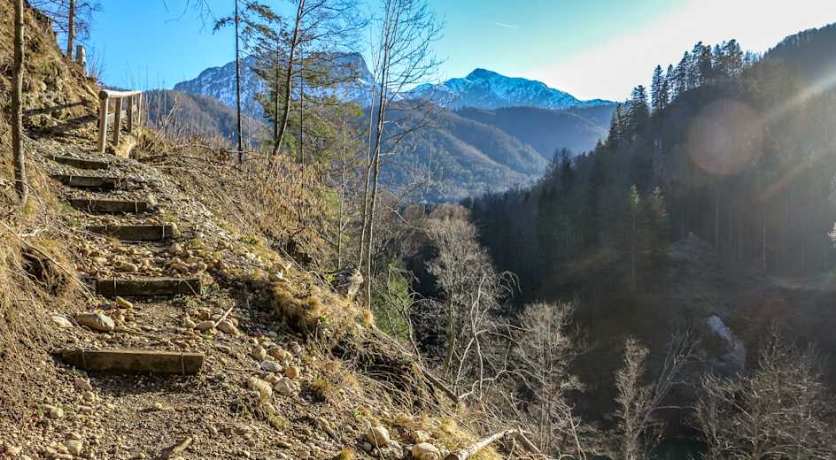 Der Abstieg führt über Pumperl zum Radstatthof, der eine Einkehrmöglichkeiten bietet. Vorbei an der AVIA Tankstelle Moser und am Landhotel Mooswirt erreicht man den Freizeitpark Landl und wandert über den Steinwandweg zurück zum Ausgangspunkt in Großreifling.