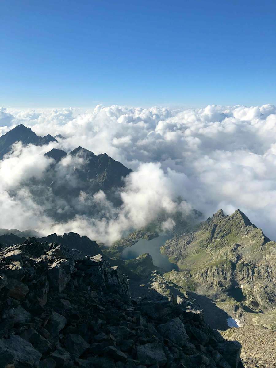 Ab hier muss man vor allem im unteren Bereich aufmerksam nach den Markierungen im Fels Ausschau halten. Der Steig führt abwechseln über Geröll, Blockgelände und den grasigen Südrücken teilweise etwas exponiert bis zum Südwestgrat. Hier folgt man nun entweder direkt dem Grat oder hält sich rechts darunter und erreicht über große Felsblöcke und geröllige Pfade das große Gipfelkreuz auf 3.125 m.