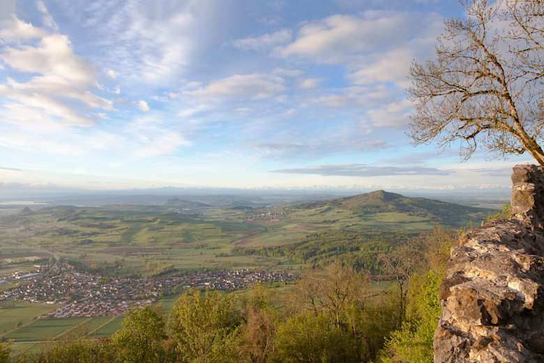 Der Weg teilt sich und man geht nach links zum Gipfel des Hohenhewen. Hier kann man gemütlich eine Pause einlegen und die tolle Aussicht über den Hegau zu genießen. An schönen Tagen blickt man zu den Alpen und zum Bodensee. Zudem besucht man noch die Burgruine mit ihrer Aussichtsplattform.