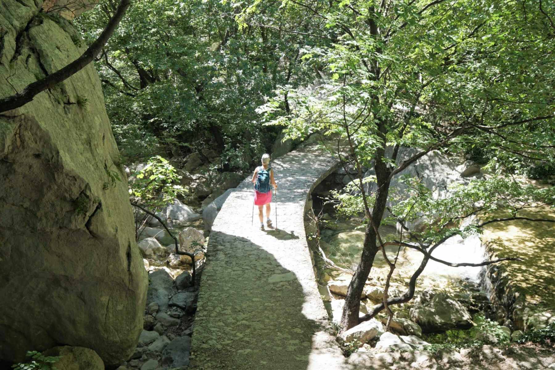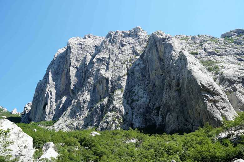 Vom Gipfel führt der Abstieg steil in das Tal der Velika Paklenica. Auf rund 500 m Seehöhe bieten gleich drei Schutzhütten Möglichkeit zu einer Stärkung. Die traditionelle Bohnensuppe oder der lokale Rohschinken mit Käse sind ein heißer Tipp. Die Schlucht der Velika Paklenica ist 14 km lang und im Gegensatz zur Mala Paklenica touristisch stark frequentiert. Die bis zu 700 m hohen Felswände, die zahlreichen Wasserfälle und idyllischen Tümpel sind auch wirklich einen Besuch wert. Am Ortsbeginn von Starigrad angekommen gilt es, über eine Straße 4 km weit zurück zum Auto zu marschieren. Als Alternative kehrt man in der Taverna Konoba Marasović ein und lässt sich nach einer köstlichen Fischplatte mit dem Taxi zum Parkplatz chauffieren.
